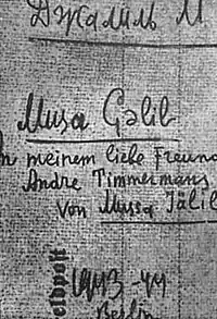El 23 de abril de 1945, un soldado del 79 Cuerpo de Infantería del Ejército Rojo encontró en medio de los combates en Berlín, un libro con unas líneas escritas en ruso en las páginas en blanco: "Yo soy el poeta tártaro Musá Cälil, detenido en la prisión de Moabit en calidad de prisionero de guerra, contra el cual se han hecho cargos políticos y seguramente seré ejecutado pronto. Si algún ruso lee esta nota, lleve mis saludos a mis amigos escritores en Moscú y dé la noticia a mi familia". Los soldados enviaron la nota a la Unión de Escritores en Moscú, y se tuvo por primera vez noticia del heroísmo de Cälil.[2]