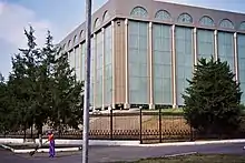 Los arquitectos soviéticos Abdulov, Nikiforov y Rosenblum diseñaron el edificio del museo en la forma de un cubo enorme, con todos sus lados separados en cuadrados de metal, forrados con hojas de aluminio en el exterior. La parte inferior del edificio y la entrada están decoradas con mármol gris pulido. La parte superior está acristalada con satélites cromados, filtrando la luz solar y configurando la iluminación interna opaca.[5]