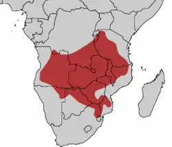 La especie se encuentra en el sur de África, desde Ruanda y Angola hasta Sudáfrica.