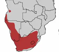 Es un pájaro no migratorio que habita en las montañas y zonas rocosas del sur y oeste de Namibia, el oeste de Angola, Sudáfrica, Suazilandia y Lesoto.