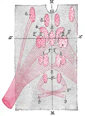 1. Núcleo dorsal posterior. 1 '. Núcleo ventral posterior. 2. Núcleo dorsal anterior. 2 '. Núcleo ventral anterior. 3. Núcleo central. 4. Núcleo de Edinger-Westphal. 5. Antero-interna del núcleo. 6. Antero-externa del núcleo. 8. Fibras cruzadas 9. Nervio troclear, con 9 ', su núcleo de origen, y 9 ", su decusación. 10. Tercer ventrículo. M, M. Línea media. | ||