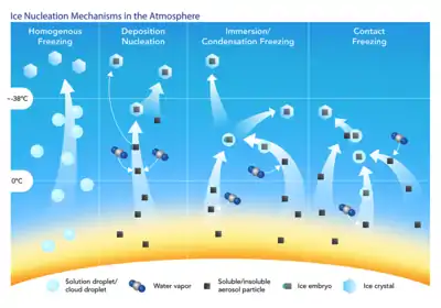 Hay una serie de mecanismos de nucleación de hielo en la atmósfera a través de los cuales los núcleos de hielo pueden catalizar la formación de partículas de hielo. En la troposfera superior, el vapor de agua puede depositarse directamente sobre partículas sólidas. En nubes más cálidas que alrededor de −37°C, donde el agua líquida puede persistir en un estado sobre enfriado, los núcleos de hielo pueden hacer que las gotas se congelen.[1]