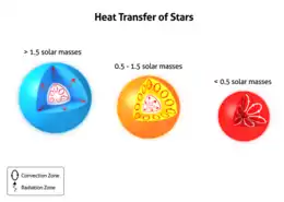 Por debajo de aproximadamente de 1,2 M☉, la producción de energía al núcleo estelar se realiza principalmente a través de la reacción de cadena protón-protón, un proceso que sólo requiere hidrógeno. Para las estrellas superiores a esta masa, la generación de energía proviene cada vez más del ciclo CNO, un proceso de fusión de hidrógeno que utiliza átomos intermedios de carbono, nitrógeno y oxígeno. Al Sol, sólo el 1,5% de la energía limpia proviene del ciclo CNO. Para estrellas con 1,5 M☉ donde la temperatura del núcleo llega a los 18 MK, la mitad de la producción de energía proviene del ciclo CNO y la mitad de la cadena pp.[5] El proceso CNO es más sensible a la temperatura que la cadena pp, con la mayor parte de la producción de energía cerca del centro de la estrella. Esto se traduce en un gradiente térmico más fuerte, que crea inestabilidad convectiva. Por lo tanto, la región central es convectiva para las estrellas de más o menos aproximadamente 1,2 M☉.[6]