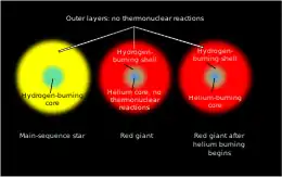 Una vez el suministro de hidrógeno al núcleo de una estrella de masa baja con por lo menos 0,25 M☉[8] se ha agotado, dejará la secuencia principal y evolucionará a lo largo de la rama gigante roja del diagrama de Hertzsprung-Russell. Aquellas estrellas en evolución con hasta aproximadamente 1,2 M☉ contraerán su núcleo hasta que el hidrógeno empiece a fusionarse a través de la cadena pp a lo largo de un caparazón alrededor del núcleo de helio inerte, pasando a lo largo de la rama subgigante. Este proceso aumentará constantemente la masa del núcleo de helio, haciendo que la capa de fusión de hidrógeno aumente de temperatura hasta que pueda generar energía a través del ciclo CNO. Debido a la sensibilidad a la temperatura del proceso CNO, esta capa de fusión de hidrógeno será más delgada que antes. Las estrellas convectoras sin núcleo por encima de 1,2 M☉ que han consumido su núcleo de hidrógeno a través del proceso CNO, contraen sus núcleos y evolucionan directamente a la etapa de gigante. El aumento de la masa y la densidad del núcleo de helio hará que la estrella aumente en medida y luminosidad a medida que evoluciona hacia la rama gigante roja.[10]