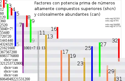 A continuación se enumeran los primeros 10 números altamente compuestos superiores y su factorización.