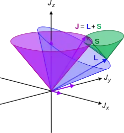 Si es el momento angular de espín de la partícula y es el vector momento angular orbital, el momento angular total es[1]
