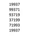 ![]() Los números generados al permutar cíclicamente los dígitos de 19937. El primer dígito se elimina y se vuelve a agregar en el lado derecho de la cadena de dígitos restante. Este proceso se repite hasta que se alcanza de nuevo el número inicial. Dado que todos los números intermedios generados por este proceso son primos, 19937 es un número primo circular. | ||