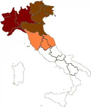 El territorio reivindicado por el nacionalismo padano incluye además del territorio denominado Padania en su acepción geográfica y lingüística (en el mapa en color rojo oscuro y marrón), las regiones de Marcas, Toscana y Umbría (en el mapa en color naranja).