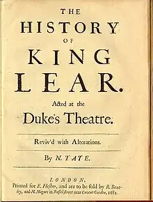 En esa época, Tate empezó a hacer adaptaciones de dramas elisabelinos. Su versión de Richard II de William Shakespeare alteró los nombres de los personajes y cambió el texto de modo que cada escena, para utilizar sus propias palabras, estaba "llena de respeto a la Majestad y la dignidad de las cortes"; sin embargo, a pesar de estas precauciones The Sicilian Usurper (1681), como se llamaba su versión, fue suprimida en la tercera actuación debido a una posible interpretación política. En 1681, Thomas Betterton representó la versión de Tate El Rey Lear, que omitía completamente el personaje de Tonto y acababa de manera feliz con el matrimonio entre Cordelia y Edgar. [4] Aunque Joseph Addison protestó contra esta mutilación de Shakespeare, Samuel Johnson defendió la justicia poética de la adaptación de Tate. Coriolano se convirtió en The Ingratitude of a Commonwealth, representada en el Teatro Real en 1682. La farsa de Tate Duke and no Duke (impresa por primera vez en 1685, pero representada en el Teatro Real) imitaba a Trappolin suppos'd a Prince de Aston Cockayne. Tate continuó esta serie hasta el año 1707.