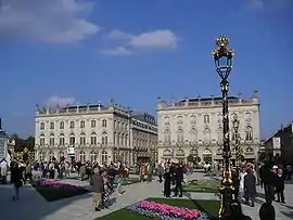 - Plaza Stanislas: "antigua plaza real Luis XV", es considerada la plaza real más bella de Europa. Hasta mediados del siglo XVII, una amplia explanada separaba la Ciudad Antigua de la Ciudad Nueva de Nancy. Stanislas Leczinski, antiguo rey de Polonia, al convertirse en duque de Lorena en 1737 proyectó establecer en este lugar una plaza destinada a honrar y glorificar a su yerno, el rey de Francia Luis XV. Primera de todas las plazas reales francesas, simboliza la imagen de carácter real y acoge las fiestas populares. Stanislas y su arquitecto Emmanuel Héré eligieron para esta plaza un lugar ideal. En el centro de esta plaza, se elevaba una estatua de bronce, obra de Barthélémy Guibal y Paul-Louis Cyfflé, que representaba a Luis XV vestido con un traje a la antigua. La estatua y sus alegorías desaparecieron durante la Revolución y en 1831 se inauguró una nueva estatua que representaba a Stanislas (obra del "premio de Roma" Jacquot).