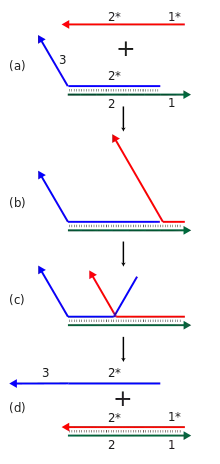 - Ensamblaje dinámico: Este enfoque controla directamente la cinética química del autoensamblado del ADN al momento de especificar a todos los intermediarios en el mecanismo de reacción aparte de la especificación del producto final. Esto se hace usando materiales iniciales que adoptan una estructura de horquilla, estos entonces se van modificando estructuralmente en una cascada de reacciones con orden específico. Este enfoque tiene la ventaja de poder realizarse mediante procesos isotérmicos (a temperatura constante) que no requieren del cambio de temperatura para el alineamiento y apareamiento de las bases para formar la estructura deseada.[28][58]