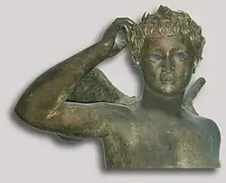 El busto de la deidad Dioniso, data del siglo II a. C.,[132] está colocada en un pilar que implica la representación de un pene; la obra, un herma, lleva la firma de Boethos de Calcedonia, nombre que llevan varios artistas del siglo III a. C. y a principios del siglo I a. C..[79] Esta firma se fijó al modelo de cera antes de la fundición del bronce.[123] El nombre de Boethos de Calcedonia se ha perpetuado durante varias generaciones y su trabajo se demuestra alrededor del año 184 a. C. en Lindos, en Delos veinte años después y luego en Atenas.[127] El pilar tiene un metro de alto con espigas a los lados; una cabeza de un Dioniso barbudo con un turbante en la cabeza,[133] constituye su parte superior. El plomo se ha colocado en la parte inferior para que el trabajo sea estable.[134] La divinidad está bien identificada debido a una hedera, atributo de Dioniso, que forma una especie de bufanda.[135] Se han encontrado modelos similares: un espécimen de mármol en Pompeya y una copia en bronce de origen desconocido, conservada en el Getty Center, pertenecen a la misma serie.[133] El trabajo se hizo en varias piezas sobre la base de un modelo de cera.[133] La restauración alemana ha permitido conocer más sobre la técnica antigua.[136]