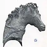Además, ciertos apliques en forma de bustos se encontraron en muy mal estado de conservación. Sin embargo, una Nike coronada de laurel y una Atenea con casco se encontraron en muy buenas condiciones.[119] Cuatro apliques que representan a Atenea, uno de ellos está muy corroído. Una Atenea está representada con una piel de cabra en el hombro, Victoria sostiene sus símbolos normales: una palma y una cinta.[151]