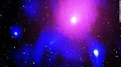 ![]() Imagen combinada del cúmulo de Ofiuco captada por el XMM-Newton y el Radiotelescopio gigante de Metrewave, con la galaxia NeVe 1 siendo el punto púrpura brillante. La nube azul en la esquina inferior izquierda sería un remanente de la explosión. | ||