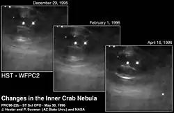 La enorme energía emitida por el púlsar crea una región particularmente dinámica en el centro de la nebulosa del Cangrejo. Si bien la mayoría de los objetos astronómicos evolucionan tan lentamente que los cambios son visibles únicamente en escalas de tiempo de muchos años, las partes centrales de la nebulosa del Cangrejo muestran cambios en escalas de tiempo de apenas unos pocos días.[24] La parte más dinámica en la zona central de la nebulosa es el punto donde el viento ecuatorial del púlsar choca contra la materia circundante de la nebulosa, formando una onda de choque. La forma y la posición de esta zona cambia rápidamente, con el viento ecuatorial que se comporta como una serie de remolinos que se acentúan, brillan y después se atenúan a medida que se alejan del púlsar muy lejos dentro el cuerpo principal de la nebulosa.
