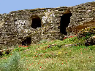 El conjunto está formado por medio centenar de estructuras funerarias y cuevas artificiales en forma de cámara circular con entradas a diversos niveles. Destaca también una gran construcción megalítica con un amplio corredor tallado en la roca arenisca, que se puede relacionar con los enterramientos megalíticos de galería cubierta.
