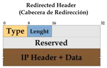 | Nombre del campo | Tamaño (bytes) | Descripción | ![]() Formato del mensaje de opción ICMPv6 Redirected Header. |