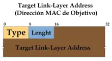 | Nombre del campo | Tamaño (bytes) | Descripción | ![]() Formato del mensaje de opción ICMPv6 TargetLink-Layer Address. |
