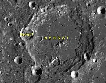 Nernst es un cráter de impacto que se encuentra en la cara oculta de la Luna, justo más allá del terminador noroeste. Se encuentra sobre la parte norte de la llanura amurallada del cráter de mayor tamaño Lorentz, invadiendo ligeramente el borde noroeste del cráter Röntgen.