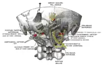 ![]() Divisiones primarias posteriores de los tres nervios cervicales superiores. (Nervio occipital mayor etiquetado en la parte superior central). | ||
