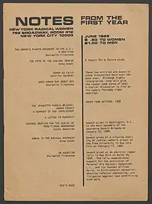 La organización compiló y publicó textos feministas en Notes from the First Year (1968), seguido por Notes from the Second Year (1970). Los principios de la organización fueron incluidos en la antología Sisterhood is Powerful: An Anthology of Writings from the Women's Liberation Movement, editado por Robin Morgan.[13]