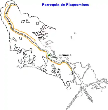 Localización de Nicholls en el mapa de la Parroquia de Plaquemines.