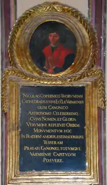 Nicolás Copérnico (en bajo alemán medio y nacido como Niklas Koppernigk; en latín, Nicolaus Copernicus; en polaco, Mikołaj Kopernik;[lower-alpha 2] en alemán, Nikolaus Kopernikus) (Toruń, Prusia Real, Reino de Polonia; 19 de febrero de 1473-Frombork, Prusia Real, Reino de Polonia; 24 de mayo de 1543) fue un polímata renacentista polaco-prusiano[2][3] [4], activo como matemático, astrónomo y canónigo católico, que formuló la teoría heliocéntrica del sistema solar, concebida en primera instancia por Aristarco de Samos, un antiguo astrónomo griego que formuló tal modelo unos dieciocho siglos antes.[5][lower-alpha 3][lower-alpha 4][lower-alpha 5]
