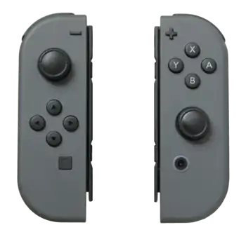 Cada Joy-Con incluye cuatro botones de acción delanteros (el Joy-Con R tiene los botones ABXY clásicos de Nintendo, y el Joy-Con L tiene la cruz de botones), un joystick analógico que se puede pulsar como quinto botón, los botones más (+) y menos (-) y dos botones como gatillos. Por la guía hay dos botones adicionales (los botones SL y SR) que pueden funcionar como botones extra cuando el Joy-Con se coge horizontalmente.[69] Cada Joy-Con también cuenta con controles de giroscopio así como una función llamada vibración HD que pueden ofrecer una respuesta táctil al jugador; Nintendo lo ha descrito diciendo que el jugador puede percibir el choque de los cubitos dentro de un vaso, saber el número de cubitos y notar como se llena el vaso con agua.