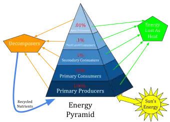 En general, cada nivel trófico se relaciona con el inferior absorbiendo parte de la energía que consume y, de este modo, puede considerarse que descansa en el nivel trófico inmediatamente inferior o que se sustenta en él. Las cadenas tróficas pueden representarse en diagramas para ilustrar la cantidad de energía que pasa de un nivel de alimentación al siguiente. Esto se denomina pirámide de energía. La energía transferida entre niveles también puede considerarse como una transferencia de biomasa, por lo que las pirámides de energía también pueden verse como pirámides de biomasa, representando la cantidad de biomasa que resulta en los niveles superiores a partir de la biomasa consumida en los niveles inferiores. Sin embargo, cuando los productores primarios crecen rápidamente y se consumen rápidamente, la biomasa en un momento dado puede ser baja; por ejemplo, la biomasa de fitoplancton (productor) puede ser baja en comparación con la biomasa de zooplancton (consumidor) en la misma zona del océano.[5]