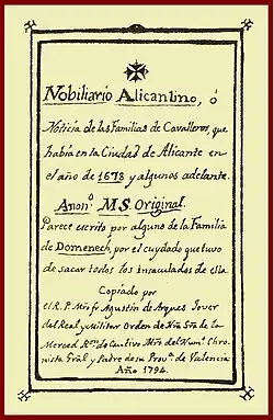 El Nobiliario Alicantino de 1678 que fue recopilado por Fray Agustín de Arques, de la Real y Militar Orden de la Merced, está considerado el auténtico tratado de la nobleza alicantina. Identifica y recoge la genealogía de las familias nobles asentadas en Alicante, así como quienes ocuparon las instituciones de la Ciudad que formó parte del antiguo Reino de Valencia (España).