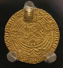 La leyenda anversa de Eduardo III Segunda acuñación:EDWARD GRA REX ANGL Z FRANC DNS HYB ("Eduardo por la gracia de Dios Rey de Inglaterra y Francia Señor de Irlanda"). Diseño: El rey, sosteniendo una espada y un escudo en un barco. Leyenda inversa: IHC AUTEM TRANSIENS POR MEDIO ILLORUM IBAT("Pero Jesús, pasando por en medio de ellos, se fue"). Diseño: 'L' en el centro de una cruz. La imagen del barco y el texto bíblico (del Evangelio de Lucas 4:30) conmemoran la victoria de Eduardo en la Batalla de Sluys en 1340.[1]