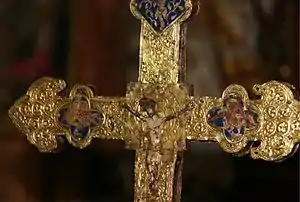 Está hecha en plata sobredorada con esmaltes en el último cuarto del siglo XIV, tal vez aprovechando las placas esmaltadas del siglo XIII. El Cristo fundido del anverso es ya del siglo XVI.[11]