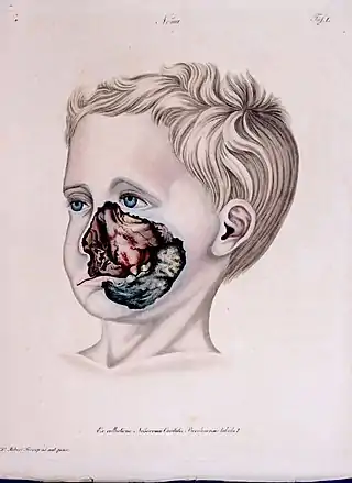 El noma,[1] también conocido como estomatitis gangrenosa o cancrum oris, es una enfermedad infecciosa gangrenosa de la boca que lleva a una destrucción de los tejidos de la cara. Afecta principalmente a niños desnutridos en quienes, de no recibir tratamiento, concluye casi siempre en un desenlace fatal.[2][3][4][5][6]