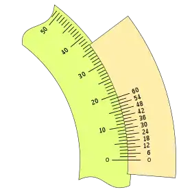 Hasta ahora hemos visto nonios o escala vernier, en el sistema decimal, donde una unidad inferior es la décima parte, esto es, un dígito a la derecha del anterior. En sistemas no decimales, como por ejemplo el sexagesimal, también se emplea este sistema de medición y la escala del nonio se puede representar en la unidad inferior.