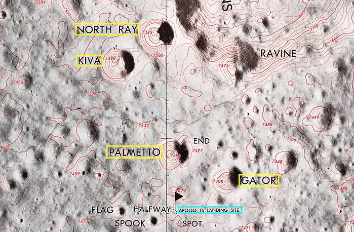 El módulo lunar Orion del Apolo 16 aterrizó entre los cráteres North Ray y South Ray el 21 de abril de 1972. Los astronautas John Young y Charles M. Duke exploraron el área entre los cráteres en el transcurso de tres EVAs utilizando un Lunar Roving Vehicle o rover. Visitaron North Ray en la EVA 3, donde situaron la Estación 11, a unos 4.4 kilómetros al norte del lugar de aterrizaje. En el camino, recorrieron el borde del cráter de tamaño similar pero más antiguo Palmetto, que está aproximadamente a 5 km al sur de North Ray.