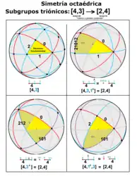 . Las matrices de reflexión generadoras son R0, R1, R2. R02=R12=R22=(R0×R1)4=(R1×R2)3=(R0×R2)2=Identidad. La simetría octaédrica quiral, [4,3]+, (![]()
