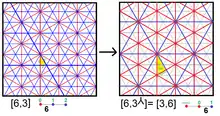 = A2×A2 = 2A2 se puede representar mediante [3]×[3] = [3]2 = [3,2,3 ]. A veces, las 2 ramas explícitas pueden incluirse con una etiqueta 2 o con una línea con un espacio: ![]()