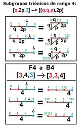 para el grupo triangular (p q r). Si los órdenes de ramificación son iguales, se pueden agrupar como un exponente según la duración del ciclo entre paréntesis, como [(3,3,3,3)] = [3[4]], que representa el diagrama de Coxeter ![]()