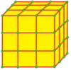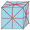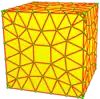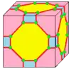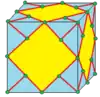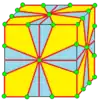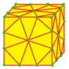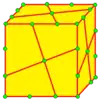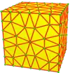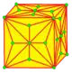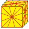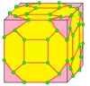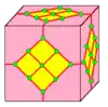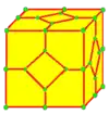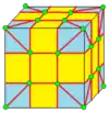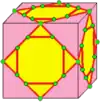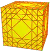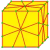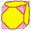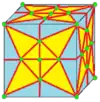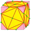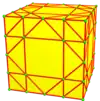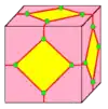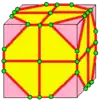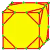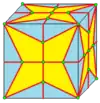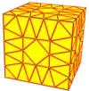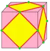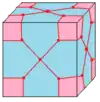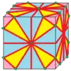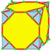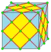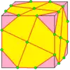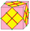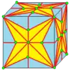 Kis levanta una pirámide en cada cara, y también se le llama akización, kleetopo, acumulación,[11] acreción o aumento piramidal. El truncado corta el poliedro en sus vértices pero deja una porción de los bordes originales.[12] El operador Zip también se denomina bitruncamiento. | |