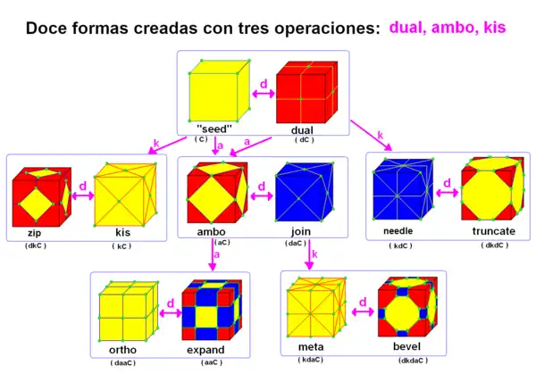 Conway y Hart ampliaron la idea de utilizar operadores, como el truncamiento definido por Johannes Kepler, para construir poliedros relacionados con la misma simetría. Por ejemplo, tC representa un cubo truncado y taC, analizado como t(aC), es (topológicamente) un cuboctaedro truncado. El operador más simple, la conjugación intercambia elementos vértices y caras para obterner figuras duales; por ejemplo, el dual de un cubo es un octaedro: dC= O. Aplicados en serie, estos operadores permiten generar muchos poliedros de orden superior. Conway definió los operadores a (ambo), b (bisel), d (dual), e (expandir), g (giro), j (unir), k (kis), m (meta), o (orto), s (achatar) y t (truncar), mientras que Hart agregó r (reflejar) y p (hélice).[3] En versiones posteriores se nombraron operadores adicionales, a veces denominados operadores extendidos.[4][5] Las operaciones básicas de Conway son suficientes para generar los sólidos arquimedianos y los sólidos de Catalan a partir de los sólidos platónicos. Algunas operaciones básicas se pueden realizar como compuestos de otras: por ejemplo, el ambo aplicado dos veces es la operación de expansión (aa= e), mientras que un truncamiento después del ambo produce un bisel (ta= b).