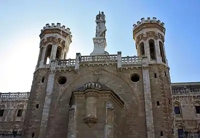La estatua de la Virgen con el niño que preside la fachada del edificio, inspirada en la estatua de Nuestra Señora de Francia, fue colocada en 1904.[6]