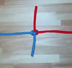 - Pase cada uno de los extremos libres alrededor del lazo en la otra cuerda, y luego por el "túnel" creado por las dos cuerdas.