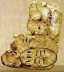 Tablilla lineal A encontrada en el Acrotiri (Santorini). Se señala el numeral 36.
