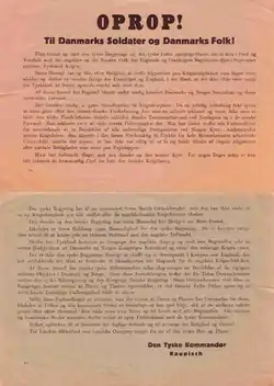El panfleto OPROP! tuvo un impacto notable en la rendición danesa. Cuando la infantería alemana llegó al Palacio de Amalienborg en la mañana del 9 de abril de 1940, se encontraron con la determinada oposición de la Guardia Real Danesa, que rechazó el ataque inicial, resultando tres heridos. Esto le dio tiempo a Cristián X y a sus ministros para conferenciar con el comandante en jefe del ejército danés William Wain Prior. Mientras se llevaban a cabo las discusiones, varias formaciones de bombarderos Heinkel He 111 y Dornier 17 sobrevolaron la ciudad, lanzando los panfletos OPROP!. Ante la amenaza explícita de la Luftwaffe de bombardear a la población civil de Copenhague, y con solo la aprobación del general Prior de continuar la lucha, el gobierno danés capituló a cambio de conservar su independencia política en los asuntos internos.[1]