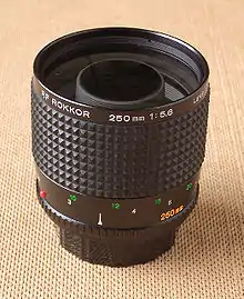 También se utilizan varios tipos de sistemas catadióptricos en lentes de cámaras de fotografía conocidos alternativamente como lentes catadióptricos (CAT), lentes reflejos o lentes de espejo. Estas lentes utilizan alguna forma de diseño de cassegrain que reduce en gran medida la longitud física del conjunto óptico, en parte doblando la trayectoria óptica, pero principalmente a través del efecto telefoto del espejo secundario convexo que multiplica la distancia focal muchas veces (hasta 4 a 5 veces).[12] Esto crea lentes con distancias focales desde 250 mm hasta 1000 mm y más que son mucho más cortos y compactos que sus contrapartes de enfoque largo o telefoto. Es más, la aberración cromática, un problema importante con las lentes refractivas largas, y la aberración fuera del eje, un problema importante con los telescopios reflectantes, se elimina casi por completo mediante el sistema catadióptrico, lo que hace que la imagen que producen sea adecuada para llenar el gran plano focal de una cámara.