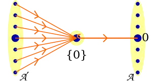 El objeto cero, por definición, debe ser un objeto terminal, lo que significa que un morfismo A → {0} debe existir y ser único para un objeto arbitrario A. Este morfismo asigna cualquier elemento de A a 0.