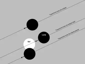 Uno de los fenómenos más espectaculares son los eclipses totales o parciales de Sol. Solo tienen lugar cuando la Luna se encuentra en la fase de Luna nueva (cada 29,5 días), es decir, cuando no se puede observar por la noche ya que se encuentra entre la Tierra y el Sol. Cuando el plano de la órbita de la Luna no es paralelo al de la Tierra, los eclipses son más bien raros, y el satélite que pasa en general “sobre” o “bajo” el Sol. En el momento del fenómeno, que dura aproximadamente dos horas y media, se puede ver el disco de la Luna cerrar progresivamente al del Sol, a menudo parcialmente, y en ocasiones por completo, cuando visto desde la Tierra, el diámetro aparente de la Luna sea sensiblemente igual al del Sol. Sin embargo, la distancia entre el Sol, la Tierra y la Luna no son constantes, dando lugar a diferentes tipos de eclipse solar: el tamaño aparente de la Luna puede ser mayor que el del Sol, sensiblemente idéntico, permitiendo así la observación (con ayuda de instrumentos) de las protuberancias solares, o más pequeño; en este caso el eclipse es anular.