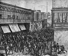 Los incendios continuaron durante toda la noche y los «bomberos» tuvieron que luchar con los soldados para poder extinguirlos, muriendo algunos de ellos, uno de los ingleses y algunos de los italianos. Como el desorden continuaba en la mañana, Mr. Champon, el Jefe de la «Guardia Urbana» [...] resolvió tomar cartas en el asunto y dispuso que la Guardia saliera [...] y se la puso a trabajar fusilando en la forma más deliberada a los soldados, sin ofrecer cuartel [...] Mataban soldados por decenas y todos los voluntarios demostraron una mortífera puntería sin jamás errar en el blanco. La Guardia Italiana, en la parte baja de la ciudad, mató a un gran número, teniendo en un caso que cargar a la bayoneta, sufriendo, me parece, la pérdida de algunos de sus hombres [...U]na gran fuerza [se dirigió] hacia el San Cristóbal y tomo posesión de la batería, afortunadamente sin oposición. Esta clase de cosas no fue del agrado de los soldados, pues pronto desaparecieron todos ellos y por la noche la ciudad se encontraba de nuevo tranquila.[30]Carta del ciudadano británico Robert Ramsay Sturrock.