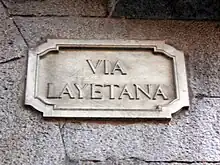El origen romano de la ciudad está presente en varias calles, todas derivadas de su nombre completo en latín: la vía Julia, procedente de la dinastía Julio-Claudia que regía el Imperio en el momento de la fundación de la ciudad;[52] la vía Augusta, por el emperador Augusto;[53] la vía Favencia, término procedente del verbo latino faveo («favorecer»), al parecer por ser una colonia exenta de tributos;[54][nota 1] y la vía Barcino, por el nombre latino de la ciudad.[55]