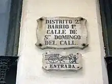 También solían nombrarse algunas calles por la presencia de edificios singulares (Palacio, Catedral) o establecimientos diversos (Hospital, Baños Nuevos). Cuenta incluso la tradición que la calle de la Carassa proviene de una carota que hay en la esquina entre esta y la calle Mirallers, y que anunciaba un burdel cercano.[61]